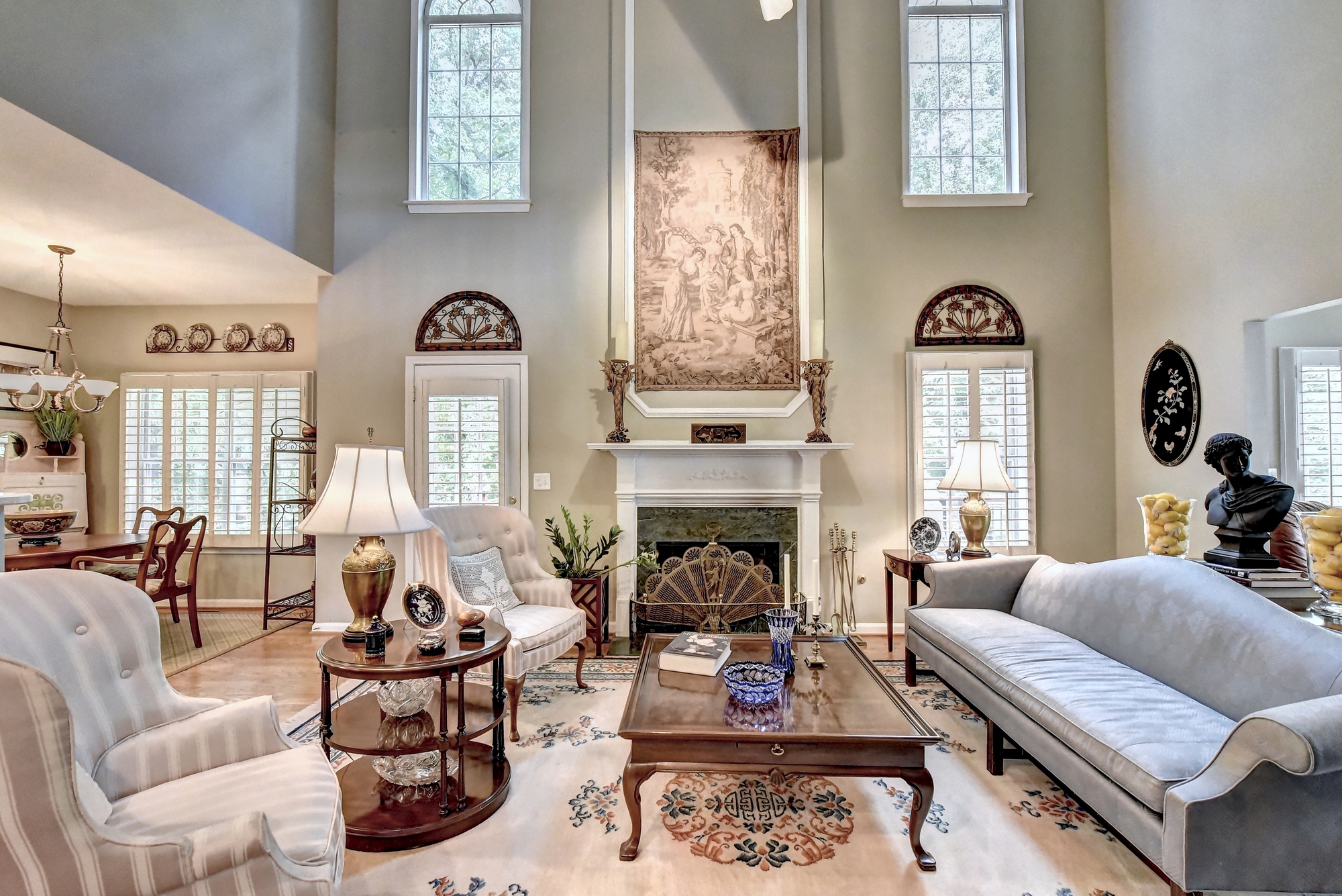 Stepping down from the entrance hall is the formal living room with two walls of windows to let in plenty of natural light, a beautiful fireplace with Federal-style mantel, and more of the woodwork you will see throughout the home.