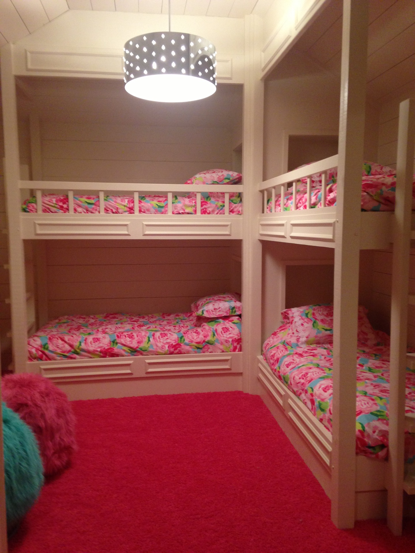 Well, my neighbors beat me to it – the bunk room, not the beach house. They took a dark room in their basement and had the builder finish it out super cute for their two girls. Each bed has a cubby-hole for a night light and whatever else the child wants to stash in there.