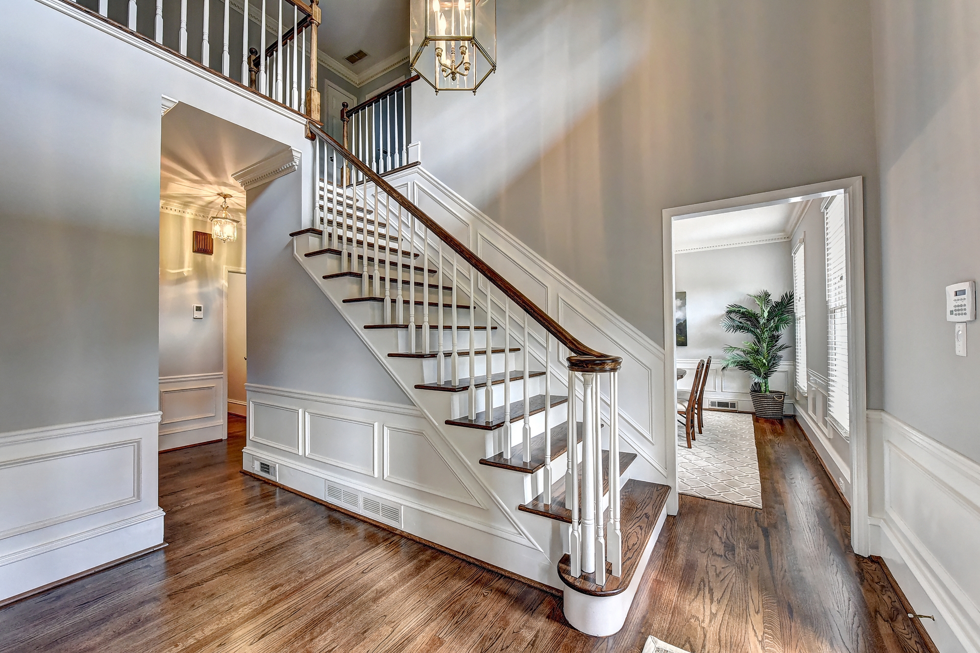 The Georgian center hall floor plan opens with a grand staircase and entrance hall and the main floor radiates out from it with living and sitting rooms on one side and dining and kitchen on the other.