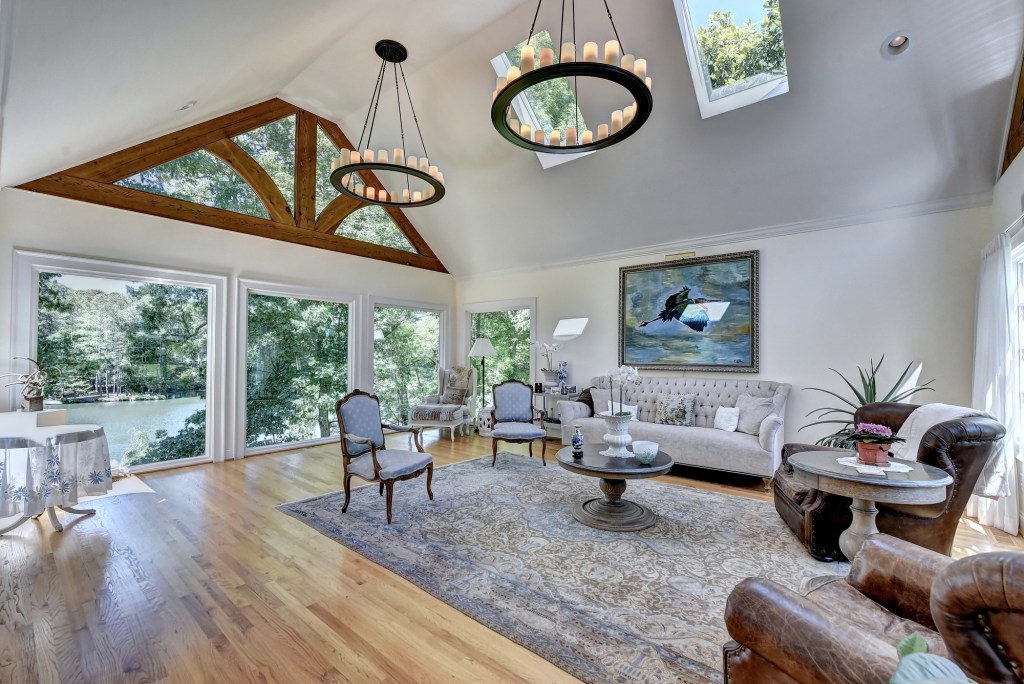 This room is dramatic from every angle, with a tall stone fire place anchoring a living area at one end, sweeping views over the lake on one side, and a handsome chef’s kitchen on the other.