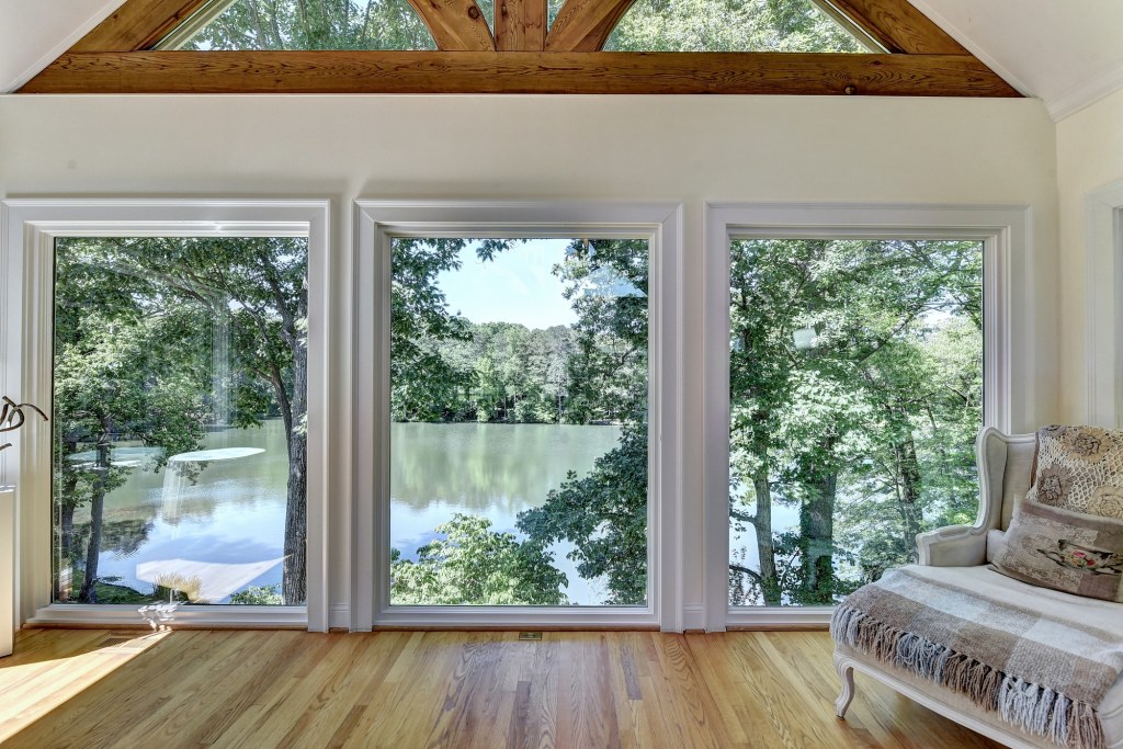 This recent addition features dramatic vaulted beams which continue in the living room with another wall of glass overlooking the serene lake on one side and the lush plantings in the front of the home on the other.