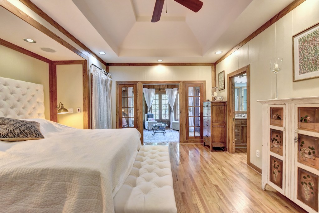 The spectacular vaulted owner’s suite is on the main floor – an entire wing of the house, in fact – with direct access to the veranda. Plaster, stone, and arching windows surround you with light and space; wide plank wooden floors, natural beams, and limestone fireplace add warmth and texture.