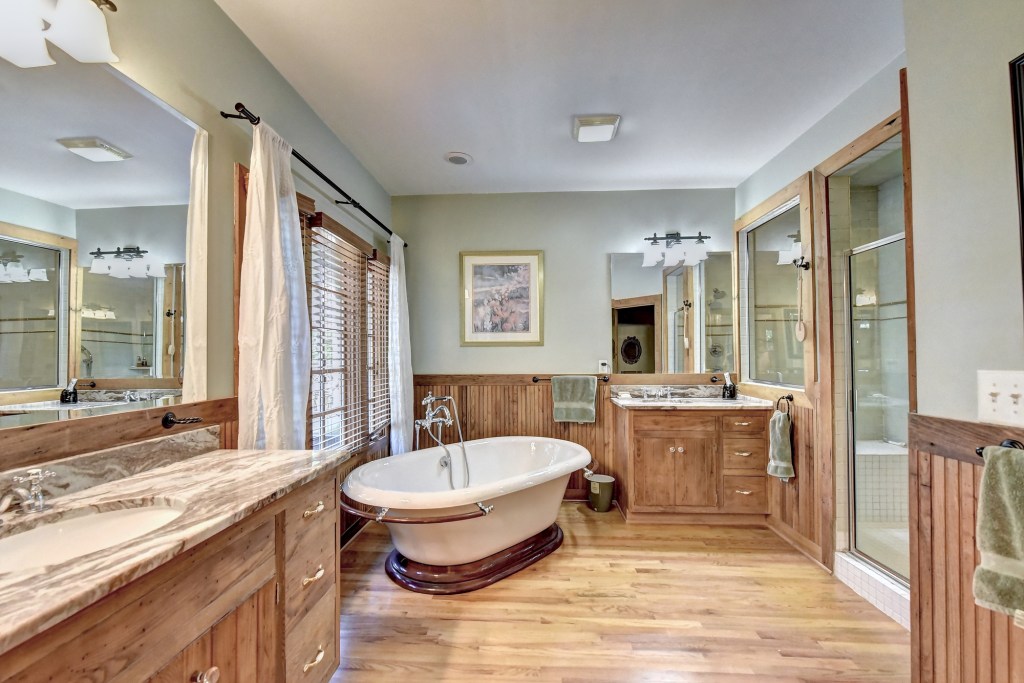 Dual vanities and a soaker tup and separate shower in the master bath just off the bedroom mean no more sharing when getting ready in the morning.